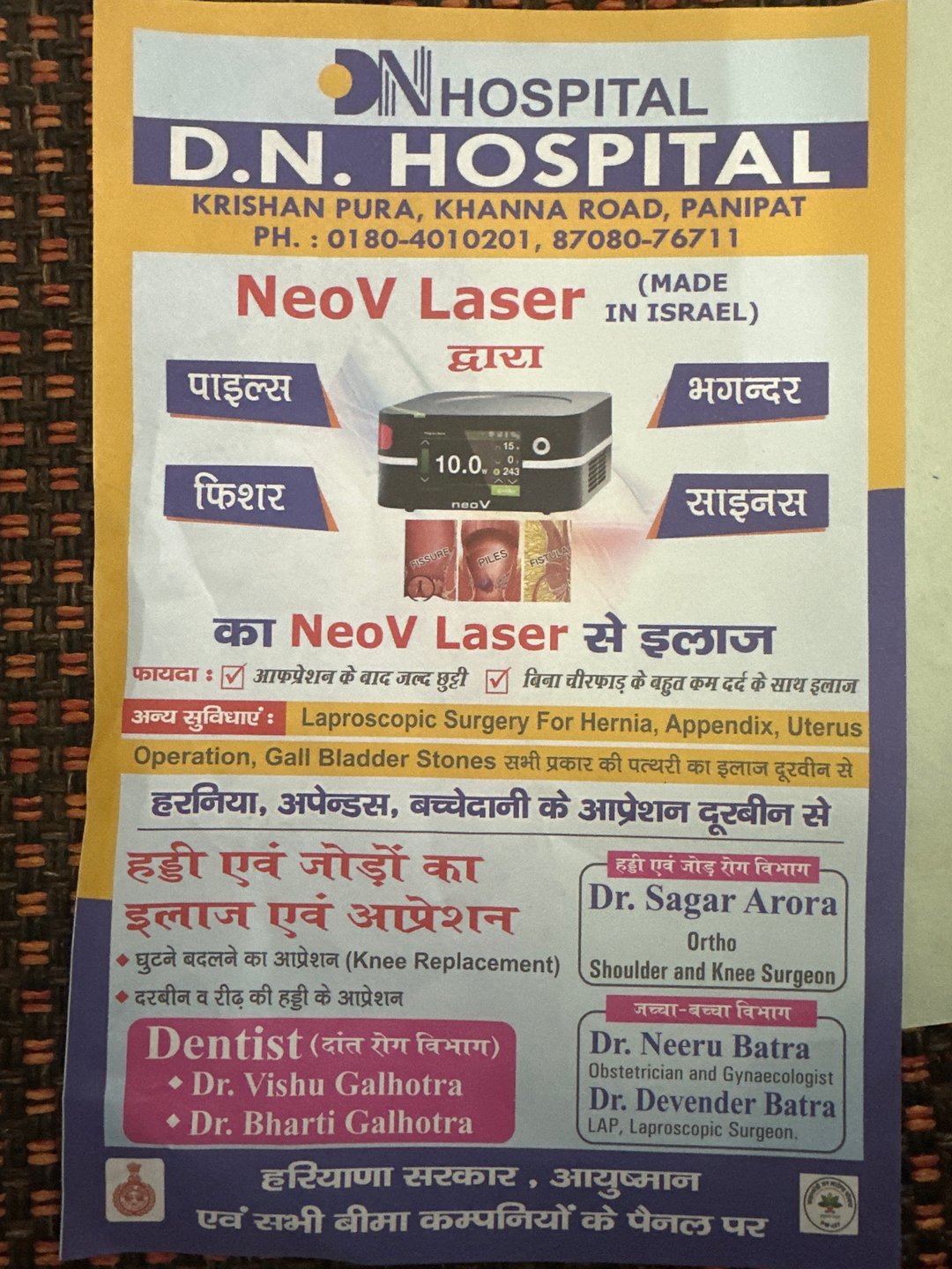 DN Hospital - Quality Care with Advanced Laser and Laparoscopic Surgeries in Panipat Located at Khanna Road, Gohana Road, Panipat, DN Hospital is an NABH-accredited, multispecialty healthcare facility. We are on the panel of all insurance companies, government schemes, and TPAs, providing cashless treatment options for your convenience. Our core specialties include advanced laser and laparoscopic surgeries for conditions such as piles, fissure, fistula, pilonidal sinus, gall bladder stones, kidney stone, hernia, appendix, Pilonidal Sinus by laser ,Laparoscopic Uterus Removal, Laparoscopic Hernia Mesh Repair Operation, Laparoscopic Appendix Removal, Gall Bladder Removal and more.